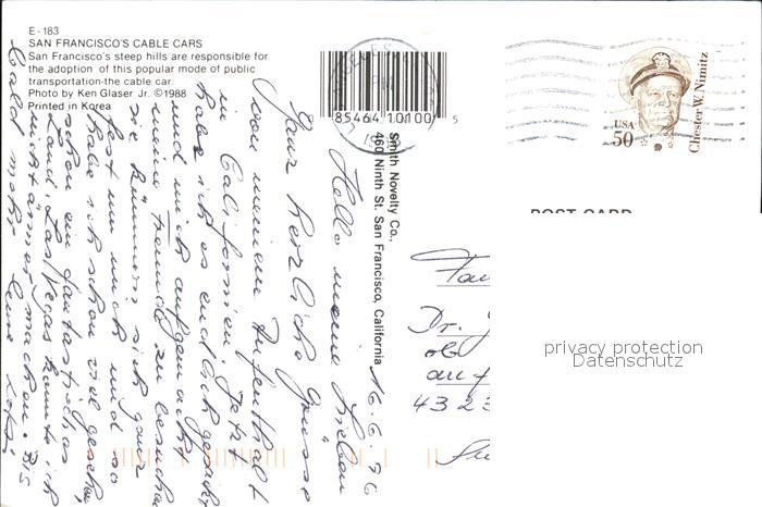 72582860 old postcard San Francisco California Cable Cars postalisch gelaufen Erhaltung siehe scans [LiesaD40] KatCode: 14140050000000