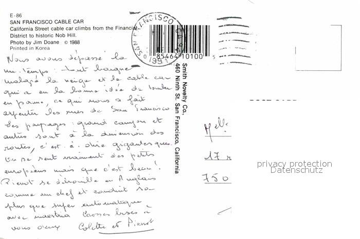 72765566 old postcard San Francisco California California Street Cable Car to Nob Hill postalisch gelaufen Erhaltung siehe scans [LiesaD40] KatCode: 14140050000000