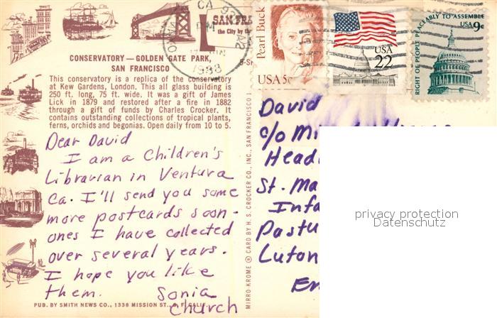 73130691 old postcard San Francisco California Conservatory Golden Gate Park postalisch gelaufen Erhaltung siehe scans [FriedD77] KatCode: 14140050000000