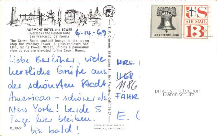 72592317 old postcard San Francisco California Fairmont Hotel and Tower postalisch gelaufen Erhaltung siehe scans [AndreD76] KatCode: 14140050000000