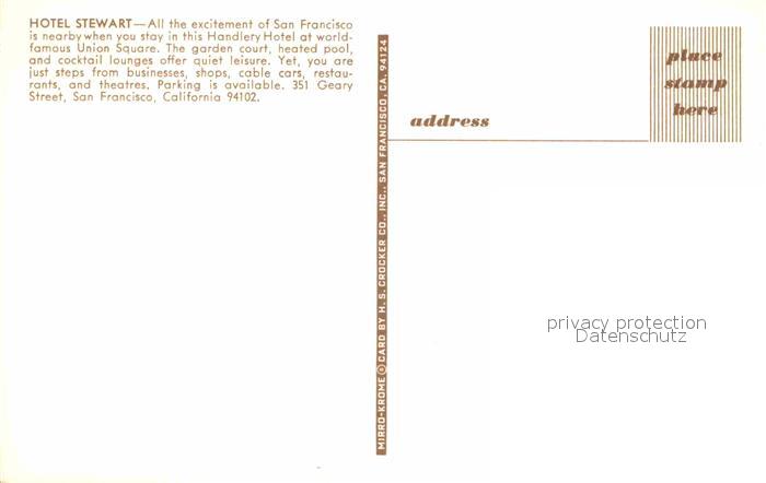 72892191 San Francisco California Hotel Stewart postalisch nicht gelaufen Erhaltung siehe scans [FriedD77] KatCode: 14140050000000