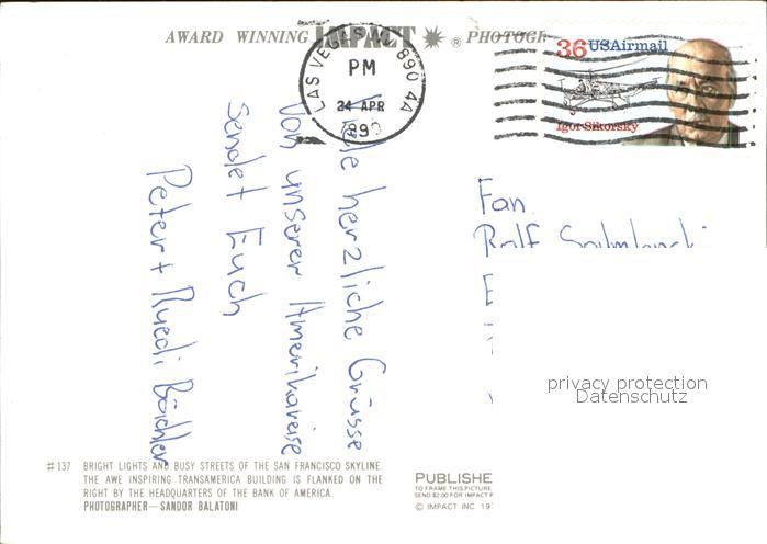 71566698 old postcard San Francisco California Skyline at night Skyscraper postalisch gelaufen Erhaltung siehe scans KatCode: 14140050000000
