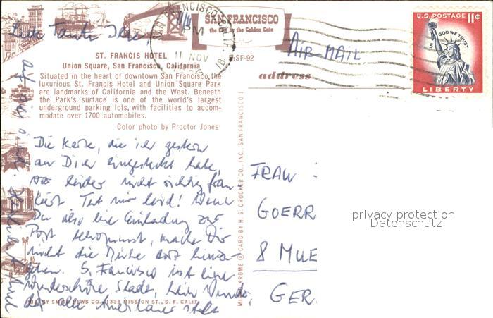 72007957 old postcard San Francisco California St. Francis Hotel Union Square postalisch gelaufen Erhaltung siehe scans KatCode: 14140050000000
