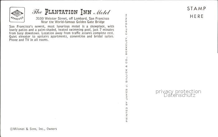 72275229 San Francisco California The Plantation Inn Motel postalisch nicht gelaufen Erhaltung siehe scans KatCode: 14140050000000