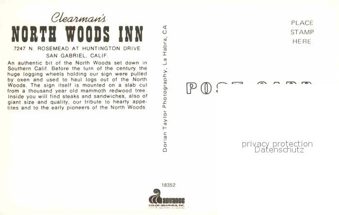 72710893 San Gabriel Clearmans North Woods Inn Restaurant postalisch nicht gelaufen Erhaltung siehe scans [LiesaD40] KatCode: 14140050000000