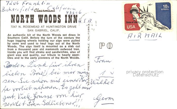 72048944 old postcard San Gabriel North Woods Inn postalisch gelaufen Erhaltung siehe scans KatCode: 14140050000000