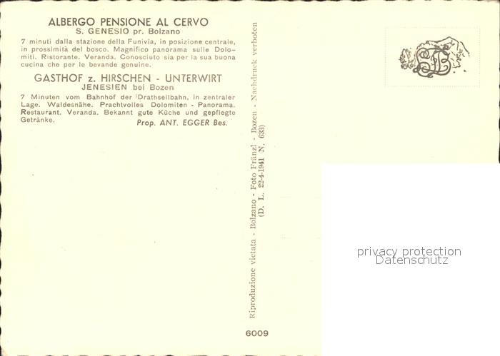 San Genesio Bozen Albergo-Pension al Cervo Gasthof zum Hirschen postalisch nicht gelaufen Erhaltung siehe scans