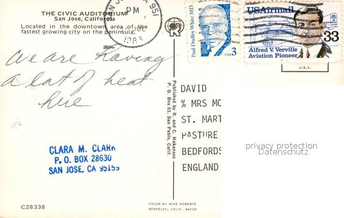 73130539 old postcard San Jose California Civic Auditorium postalisch gelaufen Erhaltung siehe scans [KathaD81] KatCode: 14140050000000