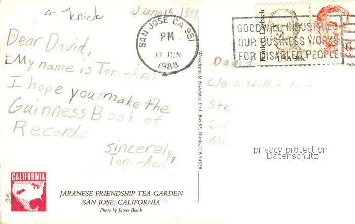73059029 old postcard San Jose California Japanese Friendship Tea Garden postalisch gelaufen Erhaltung siehe scans [WerneD78] KatCode: 14140050000000