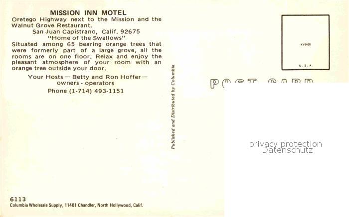 72779976 San Juan Capistrano Mission Inn Motel postalisch nicht gelaufen Erhaltung siehe scans [LiesaD40] KatCode: 14140050000000