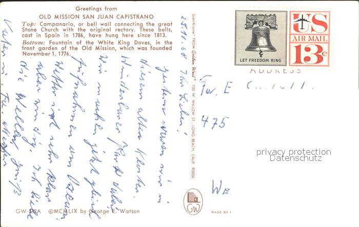 72278211 San Juan Capistrano Old Mission Campanario Bell Wall Fountain White King Doves postalisch nicht gelaufen Erhaltung siehe scans KatCode: 14140050000000
