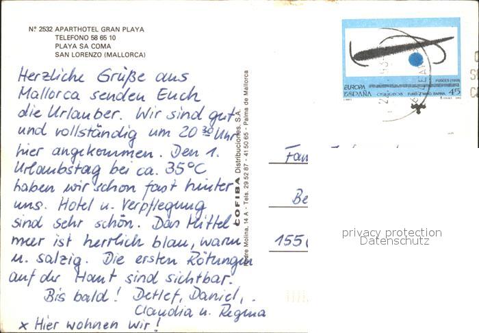 old postcard San Lorenzo Spanien Aparthotel Gran Playa postalisch gelaufen Erhaltung siehe scans