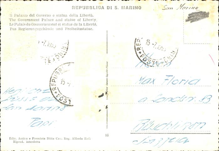 old postcard San Marino Palais du Gouvernement et statue de la Liberte postalisch gelaufen gute Erhaltung