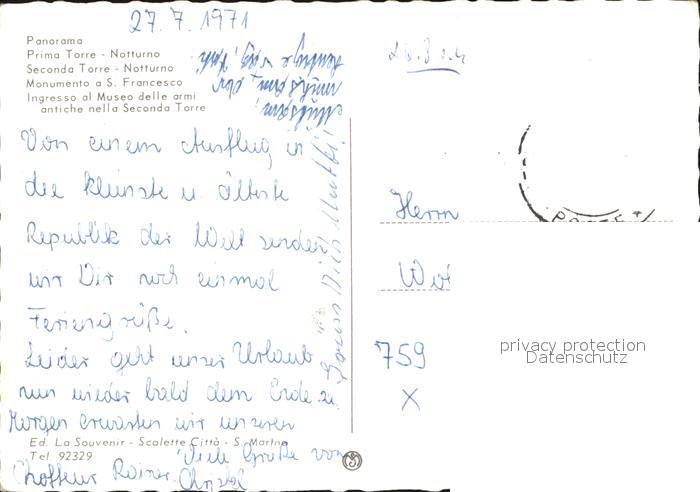 old postcard San Marino Repubblica Fliegeraufnahme Prima Torre Notturno Seconda Torre postalisch gelaufen Erhaltung siehe scans