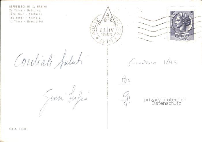 old postcard San Marino San Marino La Torre notturno Monte Titano Nachtaufnahme postalisch gelaufen Erhaltung siehe scans
