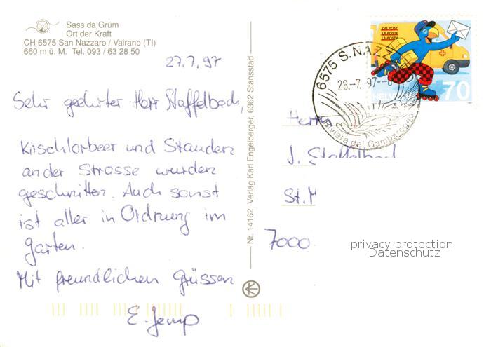 13865290 alte Postkarte San Nazzaro Lago Maggiore Panorama Sass da Gruem Luogo dell energia Ort der Kraft postalisch gelaufen Erhaltung siehe scans [FriedD77] KatCode: 11470210655008