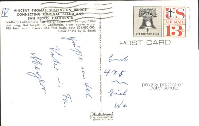 72161847 old postcard San Pedro California Vincent Thomas Bridge Suspension Bridge Terminal Island postalisch gelaufen Erhaltung siehe scans KatCode: 14140050000000