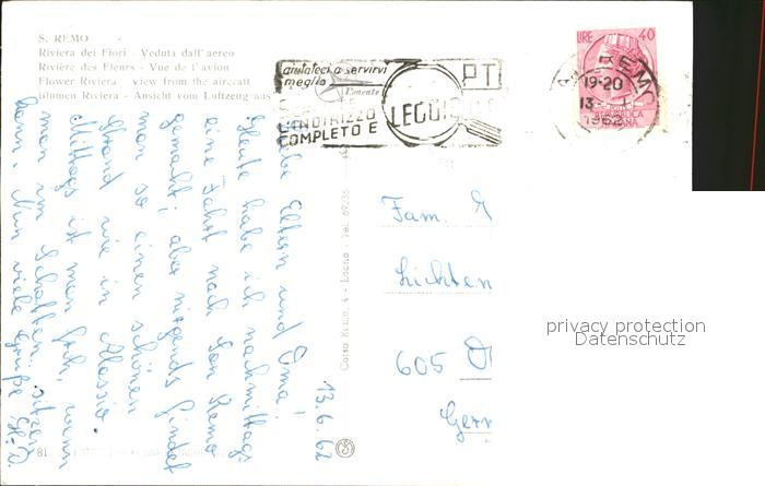 old postcard San Remo IT Fliegeraufnahme mit Hafen postalisch gelaufen Erhaltung siehe scans