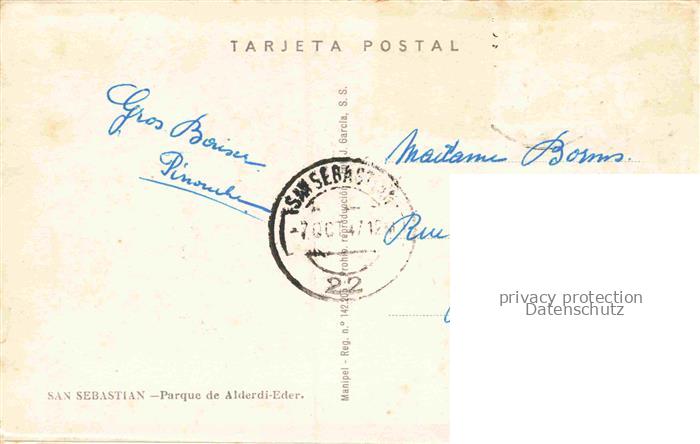 74135306 old postcard SAN SEBASTIAN DONOSTIA Saint-Sebastien Pais Vasco ES Parque de Alderdi Eder postalisch gelaufen Erhaltung siehe scans [FriedD77] KatCode: 11510