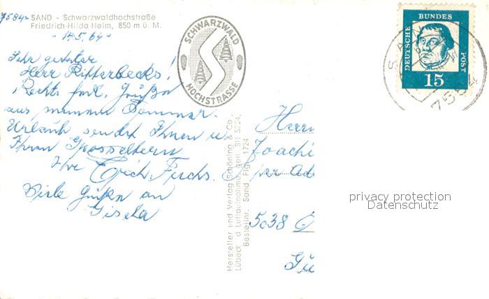 73708872 alte Postkarte Sand Buehl Friedrich Hilda Heim im Schwarzwald postalisch gelaufen Erhaltung siehe scans [FriedD77] KatCode: 11110008216007