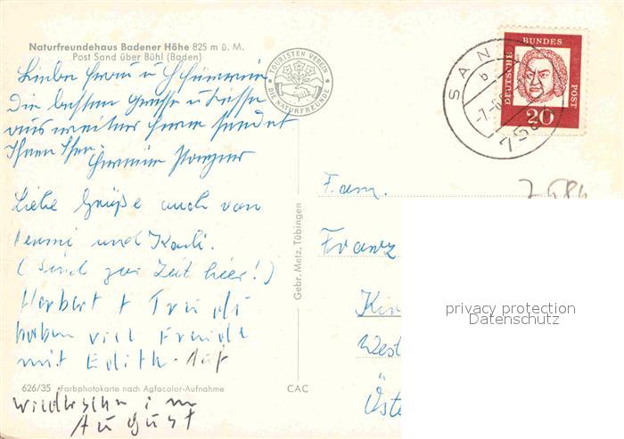 72882938 alte Postkarte Sand Buehl Naturfreundehaus Badener Hoehe postalisch gelaufen Erhaltung siehe scans [AndreD76] KatCode: 11110008216007