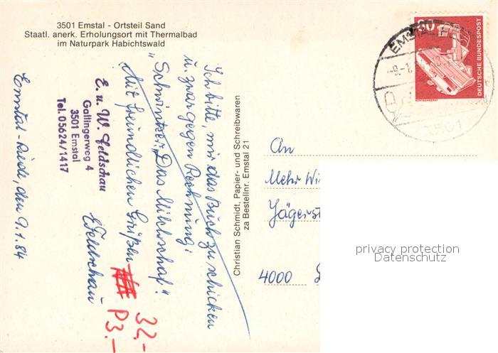 73673452 alte Postkarte Sand Emstal Thermalbad im Naturpark Habichtswald Restaurant postalisch gelaufen Erhaltung siehe scans [FriedD77] KatCode: 11110006633006
