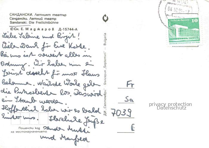 74132387 old postcard Sandanski Oblast Blagoewgrad BG Freilichtbuehne postalisch gelaufen Erhaltung siehe scans [FriedD77] KatCode: 11090
