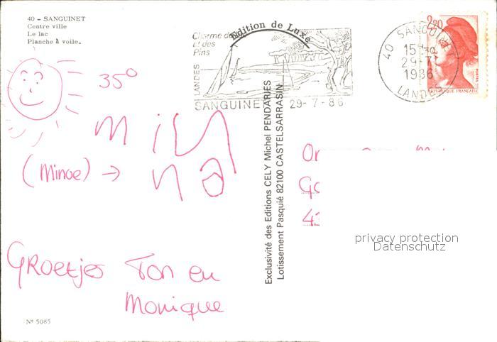 12494571 carte postale Sanguinet Stadtzentrum See Strand postalisch gelaufen Erhaltung siehe scans KatCode: 11170040240287