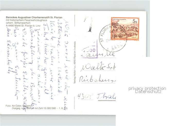 71850624 alte Postkarte Sankt Florian Barockes Augustiner Chorherrenstift Historisches Feuerwehrzeughaus Fliegeraufnahme postalisch gelaufen Erhaltung siehe scans KatCode: 11390312041013