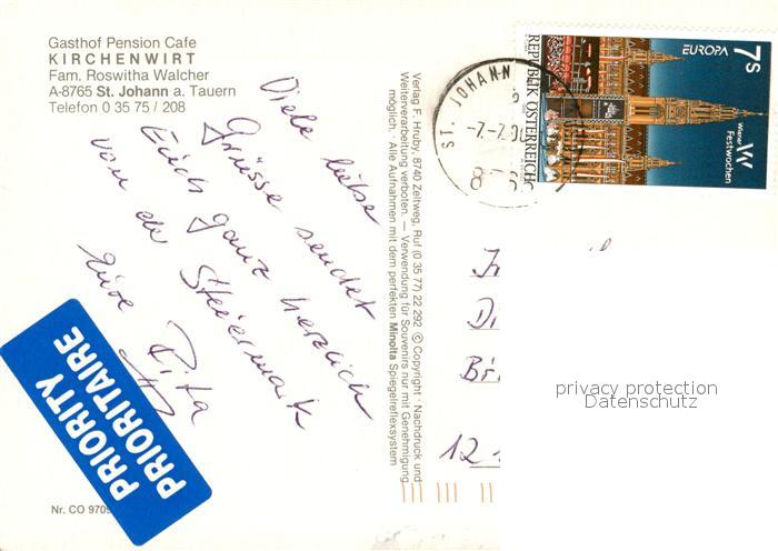 13102284 alte Postkarte Sankt Johann Tauern Cafe Kirchenwirt postalisch gelaufen Erhaltung siehe scans [NatalD47] KatCode: 11390226060819