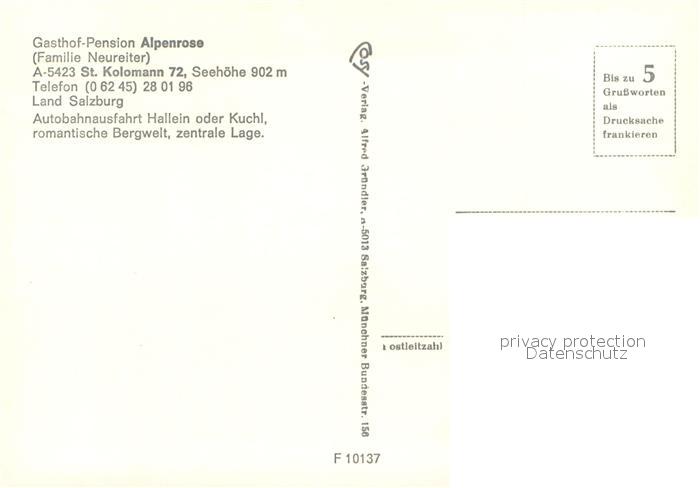 73618149 Sankt Koloman Gasthof Pension Alpenrose Terrasse Gastraum postalisch nicht gelaufen Erhaltung siehe scans [WerneD78] KatCode: 11390323050211