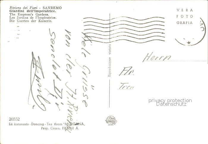 old postcard Sanremo Giardini Imperatrice Riviera dei Fiori Palmen postalisch gelaufen Erhaltung siehe scans