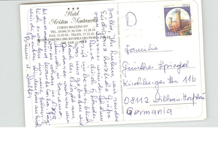 old postcard Sanremo Hotel Ariston Montecarlo postalisch gelaufen