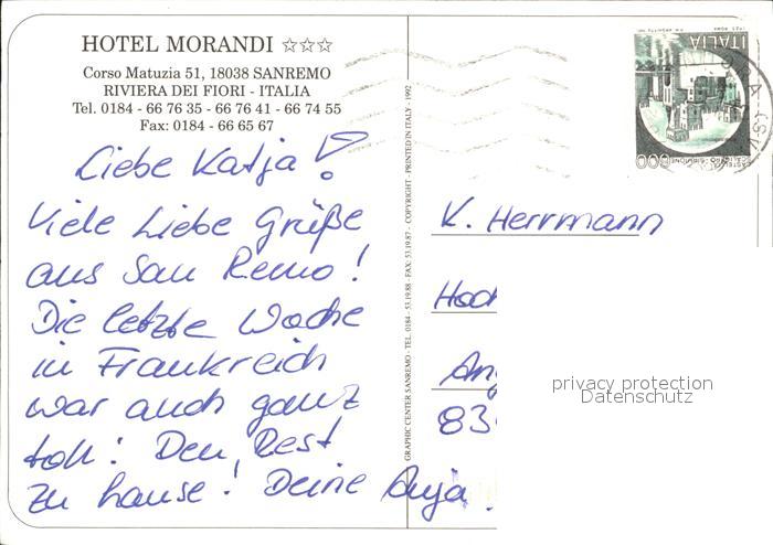 old postcard Sanremo Hotel Morandi postalisch gelaufen Erhaltung siehe scans