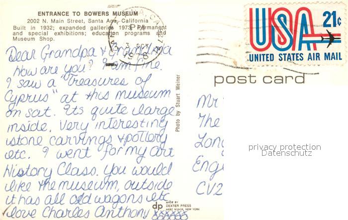 73130360 old postcard Santa Ana California Entrance Bowers Museum postalisch gelaufen Erhaltung siehe scans [NatalD47] KatCode: 14140050000000