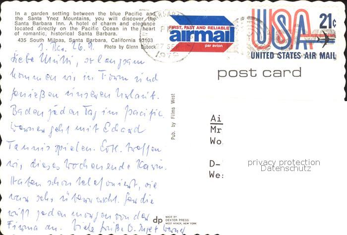 72049827 old postcard Santa Barbara California Santa Barbara Inn Swimmingpool postalisch gelaufen Erhaltung siehe scans KatCode: 14140050000000