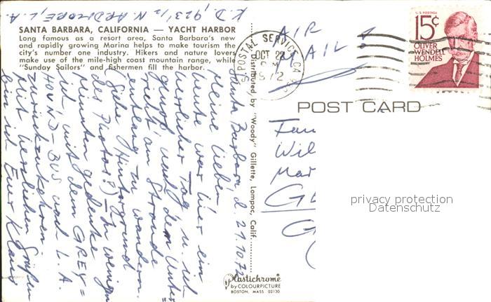 72375969 old postcard Santa Barbara California Yacht Harbor postalisch gelaufen Erhaltung siehe scans KatCode: 14140050000000
