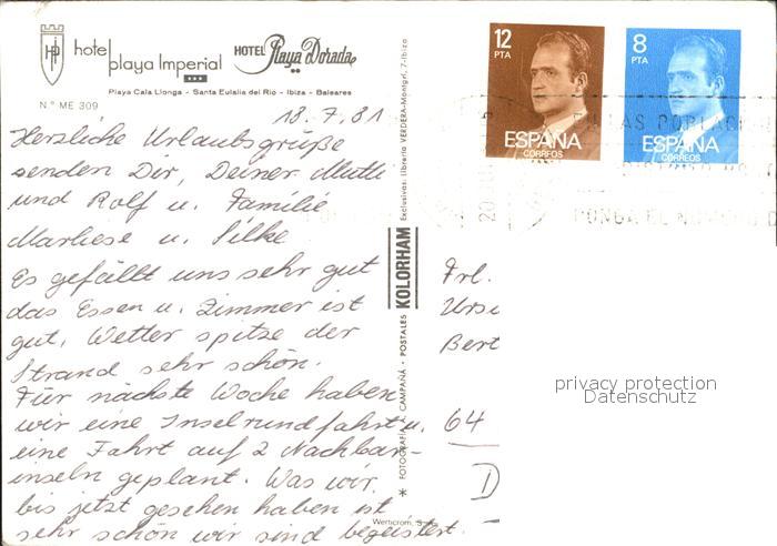 old postcard Santa Eulalia del Rio Hotel Playa Imperial und Hotel Playa Dorada postalisch gelaufen Erhaltung siehe scans