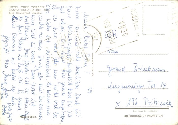 old postcard Santa Eulalia del Rio Hotel Tres Torres Piscina postalisch gelaufen Erhaltung siehe scans