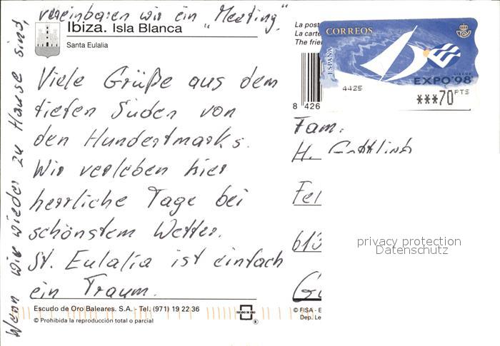 old postcard Santa Eulalia del Rio Hotelanlage Swimming Pool Strand Wasserspiele Kirchberg Nachtaufnahme postalisch gelaufen Erhaltung siehe scans