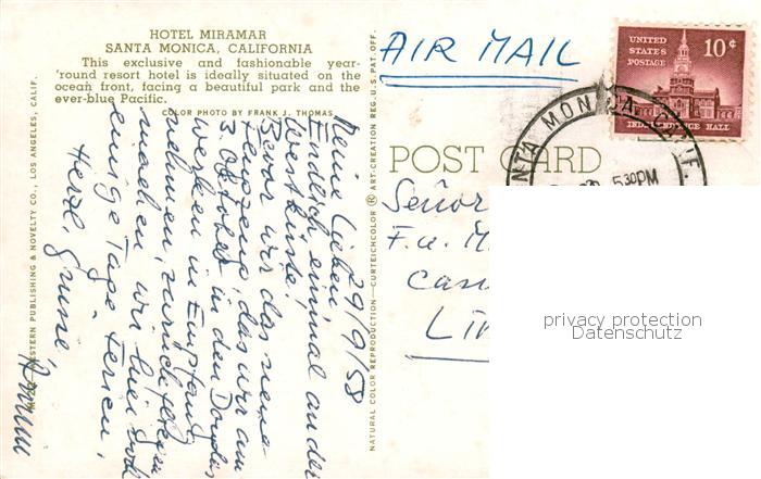 73848337 old postcard Santa Monica California USA Hotel Miramar Pool postalisch gelaufen Erhaltung siehe scans [WerneD78] KatCode: 14140050000000