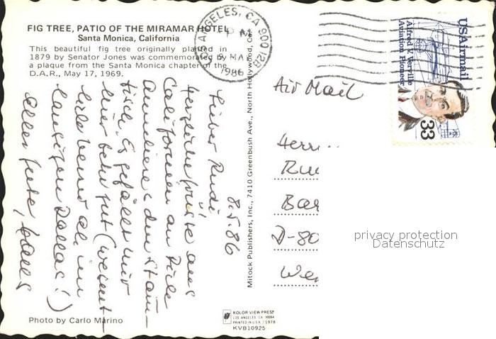 72179653 old postcard Santa Monica Fig Tree Miramar Hotel postalisch gelaufen Erhaltung siehe scans KatCode: 14140050000000