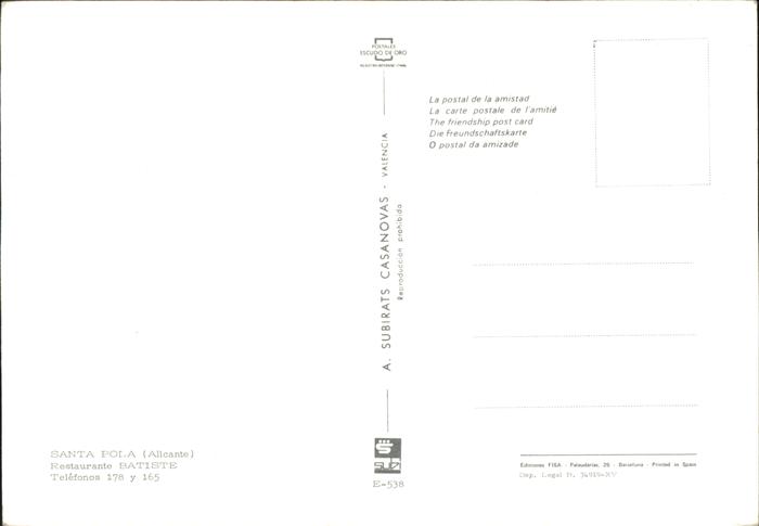 Santa Pola Restaurante Batiste postalisch nicht gelaufen Erhaltung siehe scans
