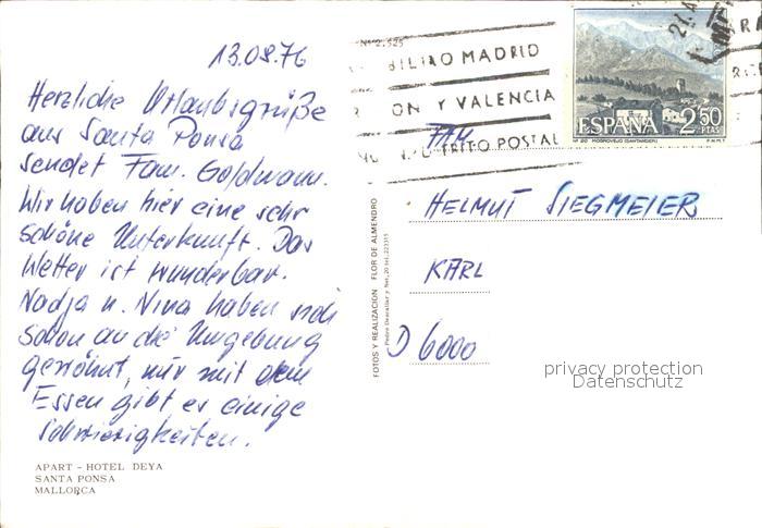 old postcard Santa Ponsa Mallorca Islas Baleares Aparthotel Deya postalisch gelaufen Erhaltung siehe scans