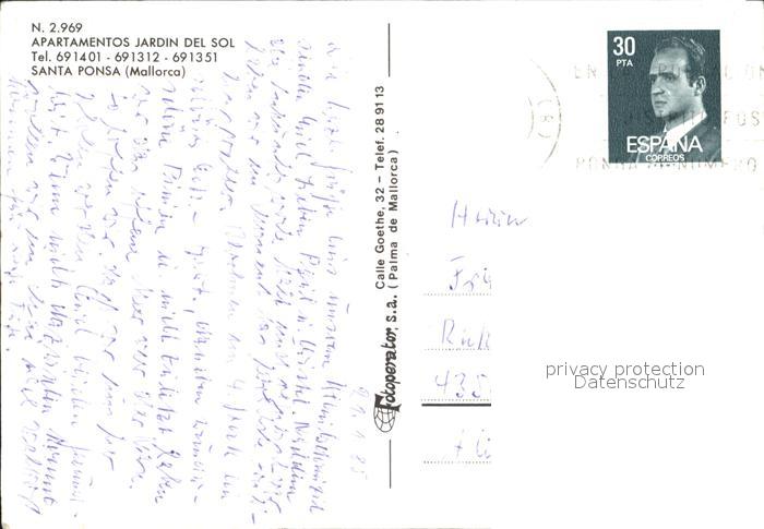 old postcard Santa Ponsa Mallorca Islas Baleares Fliegeraufnahme Apartamentos Jardin del Sol postalisch gelaufen Erhaltung siehe scans [LiesaD40]