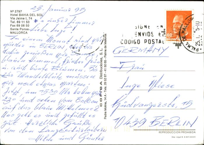 old postcard Santa Ponsa Mallorca Islas Baleares Hotel Bahia del Sol postalisch gelaufen