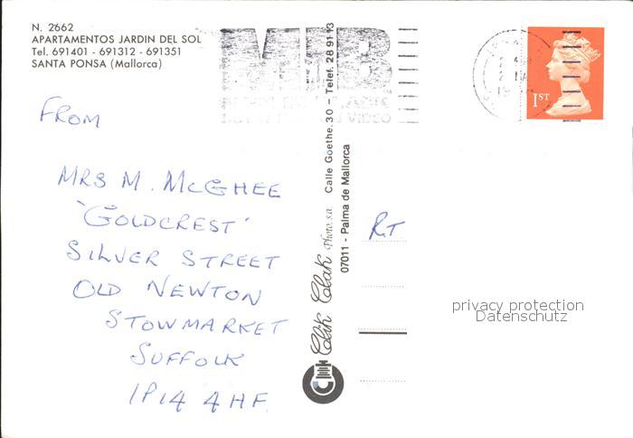 old postcard Santa Ponsa Mallorca Islas Baleares Jardin del Sol Apartementos postalisch gelaufen Erhaltung siehe scans