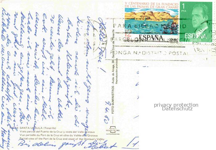 74156302 old postcard Santa Ursula Tenerife Islas Canarias ES Puerto-de-la-Cruz Valle-de-la-Orotava Bananenpflanzungen Kueste Atlantik Felsen Hochhaeuser Steilkueste Luftaufnahme postalisch gelaufen Fliegeraufnahme Erhaltung siehe scans [Karloger] KatCode: 11510