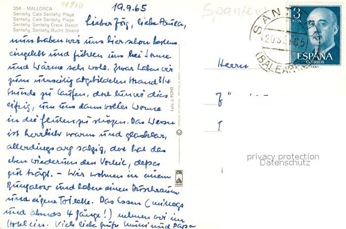 old postcard Santanyi Islas Baleares Playa Hotel postalisch gelaufen Erhaltung siehe scans [FriedD77]