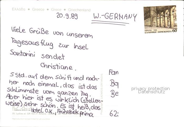 old postcard Santorin Thira Thera Kirche Teilansichten postalisch gelaufen Erhaltung siehe scans